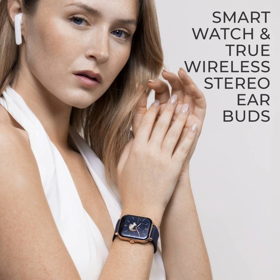 This smartwatch is designed with a 37mm rectangular pale rose gold plated case and blue silicone strap, plus comes with True Wireless Earbuds with blue charging case. The earbuds feature Bluetooth Version 5.0, a 5 hour total playing time with over 20 hours of play time combined with case charge and 10m wireless range all for your enjoyment. Once used, charge within the charging case that will give you a 1 hour charging time and 2 hour bottom base charge time.