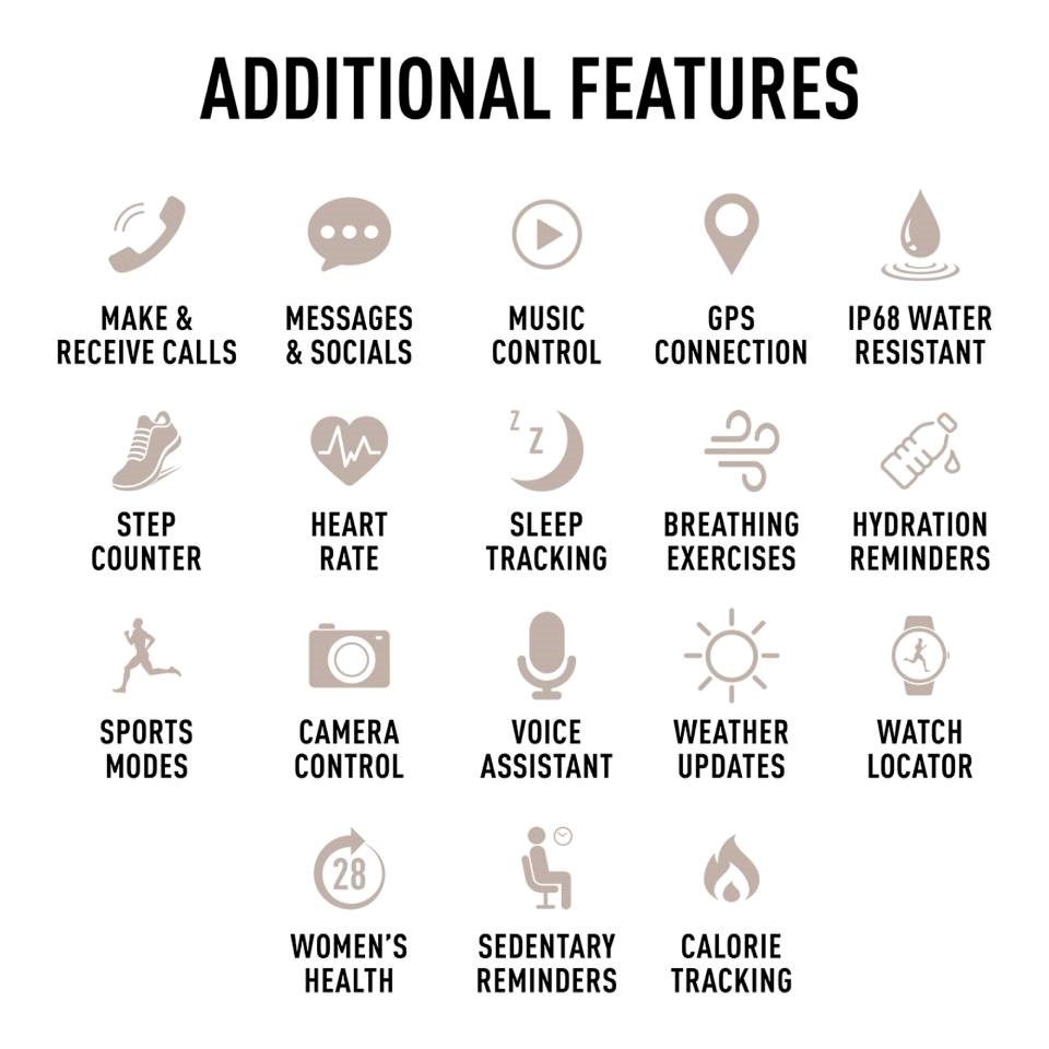 It offers all the lifestyle and wellness features you need, including helpful health benefits like step count, heart rate, blood oxygen, calories and sleep analysis. You'll also enjoy music control, GPS connection, camera control and so much more to explore!