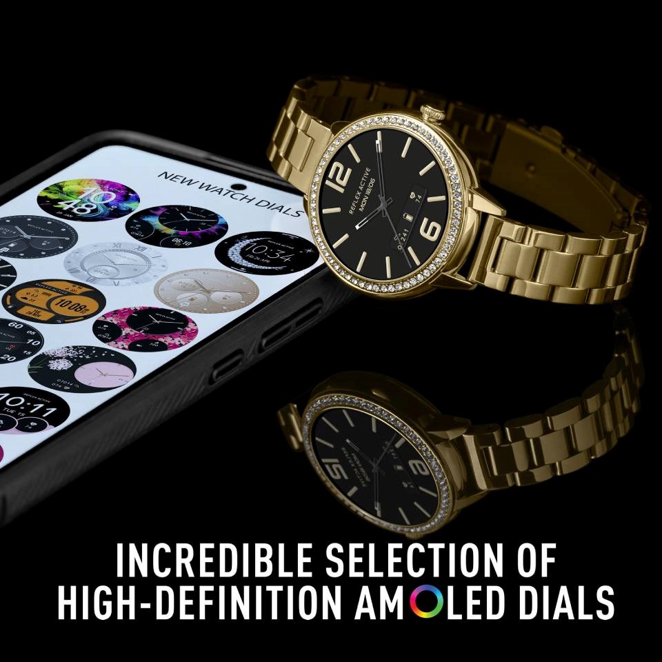 With a 38mm gold tone case, matching bracelet and pretty stone set bezel, this Reflex Active smartwatches are presented in a gift box complete with instruction manual, USB and a 2-year guarantee. Download the free Reflex Active Red App to enjoy additional functionality. IOS 12+ and Android 9.0+ Compatible.
