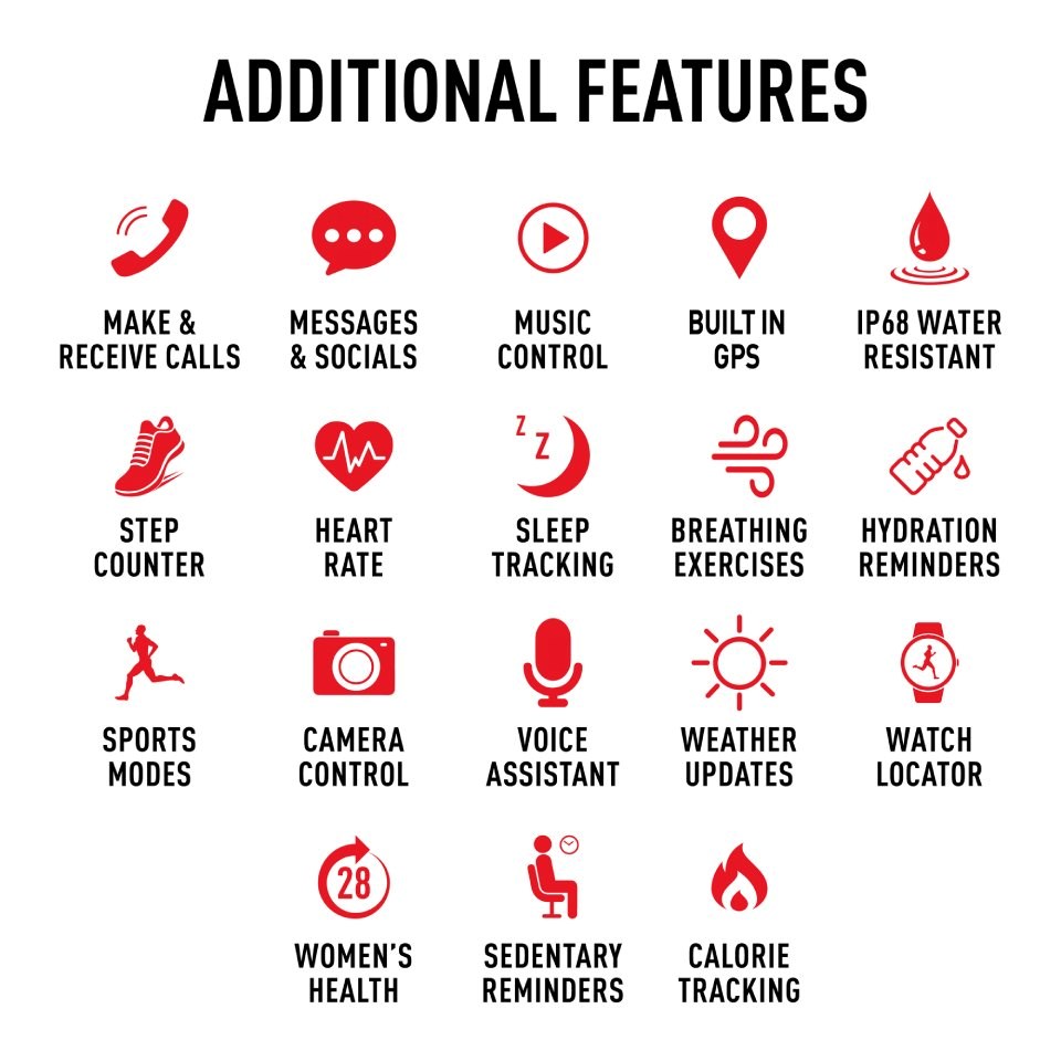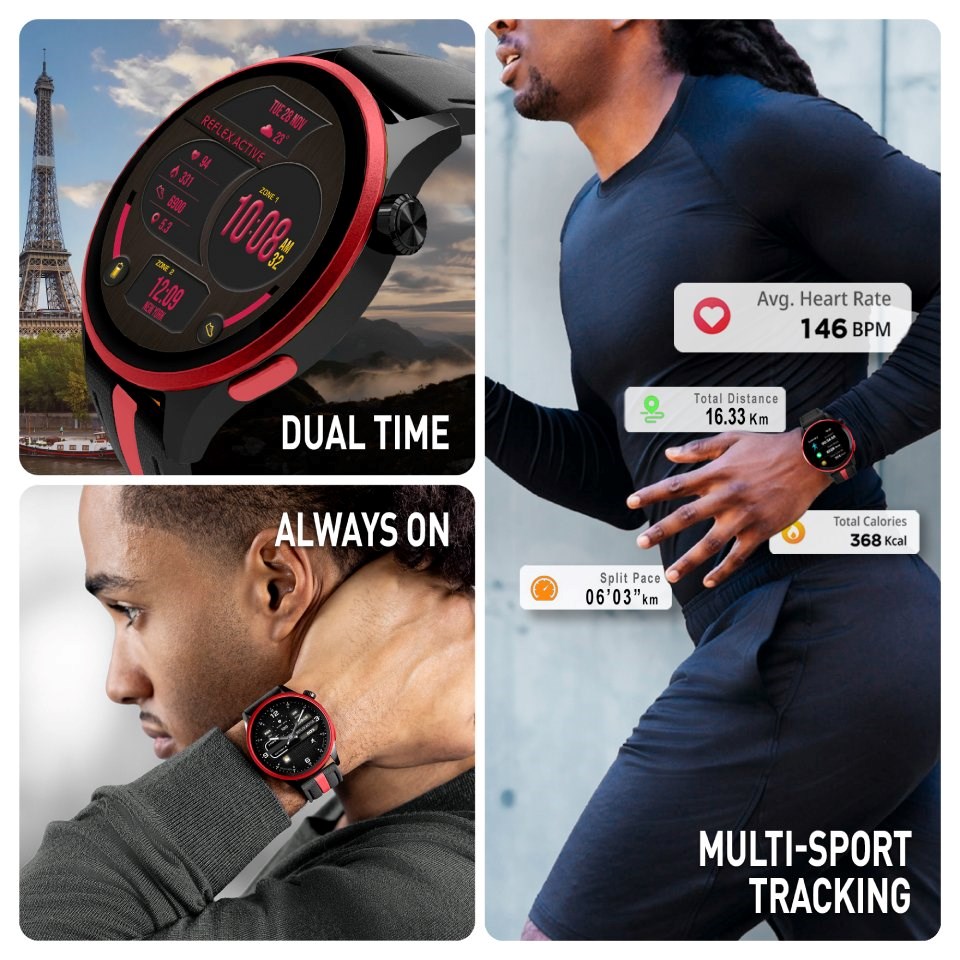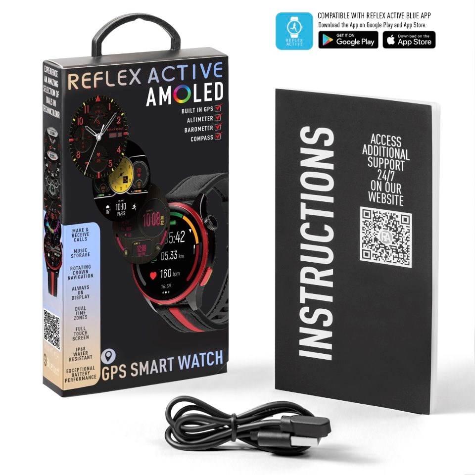 Featuring a 46mm black and red IP case, it is finished with a double injection silicone strap. Download the free Reflex Active Red App to enjoy additional functionality. iOS 12+ & Android 9.0+ compatible.