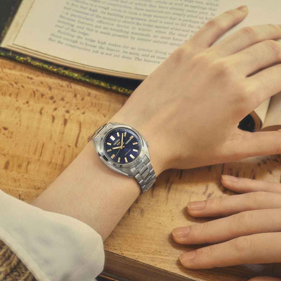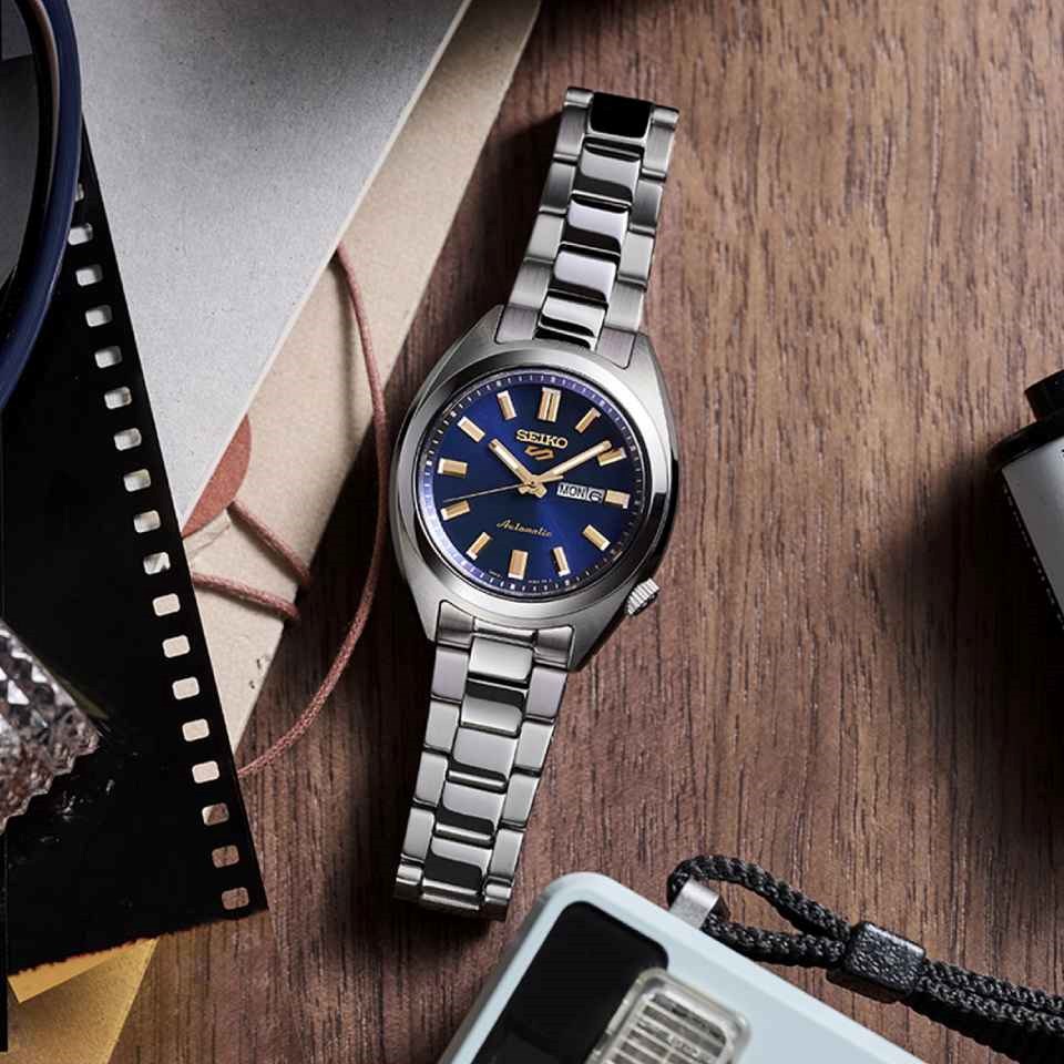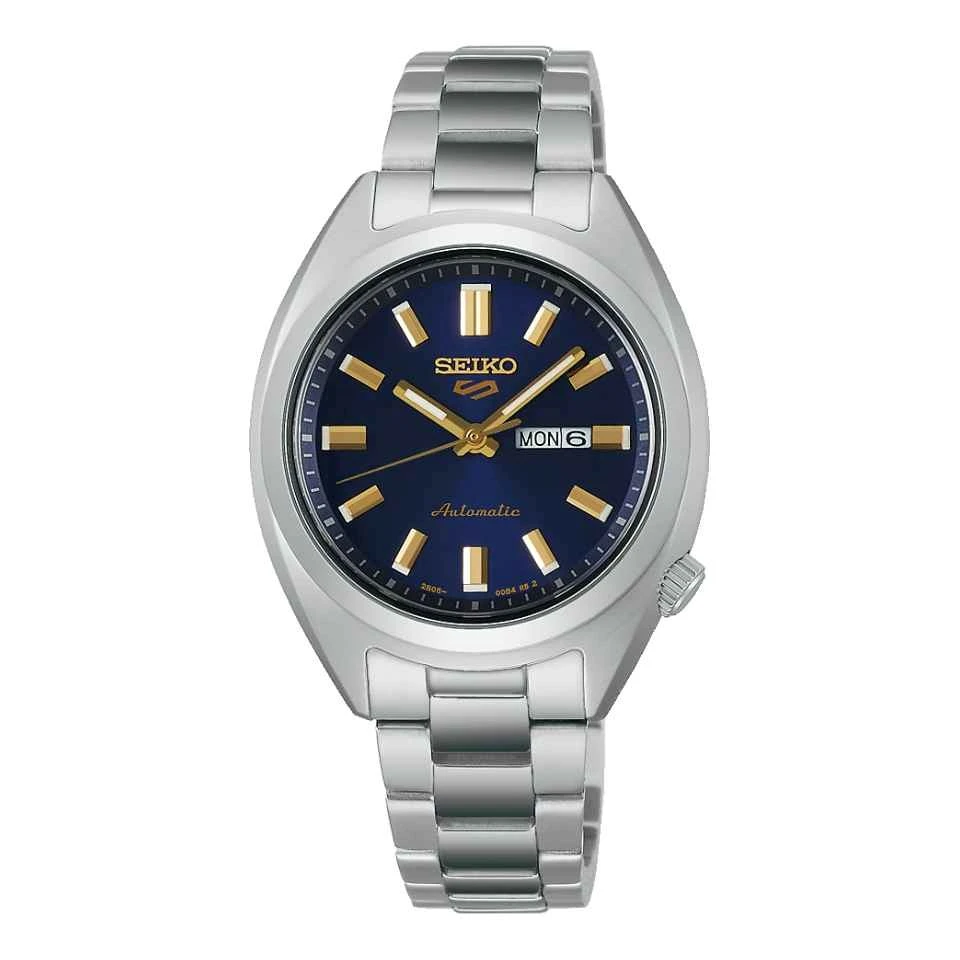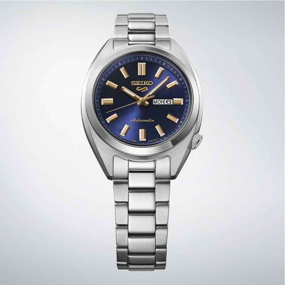 The dial is finished in a deep denim blue, elevated by fine surface details that create depth and richness. A newly designed bracelet with a smaller pitch ensures a comfortable fit while echoing the timeless character of the SNXS line. Powered by an automatic movement, this Seiko watch combines reliable timekeeping with day-date functionality. With 10 bar water resistance and a secure three-fold clasp with push-button release, it is crafted for everyday durability and ease of wear.