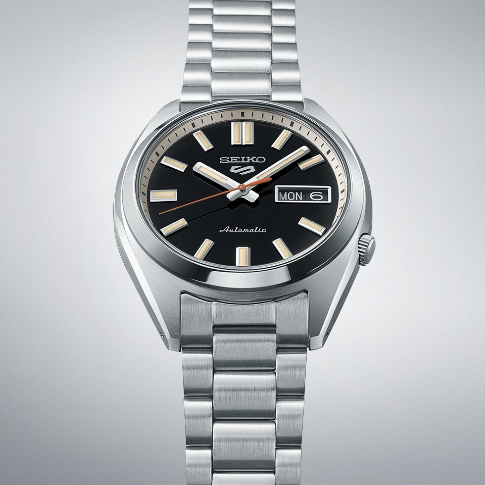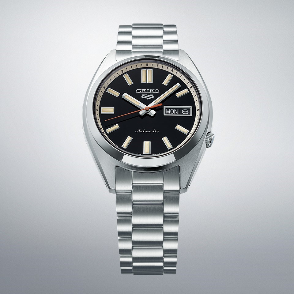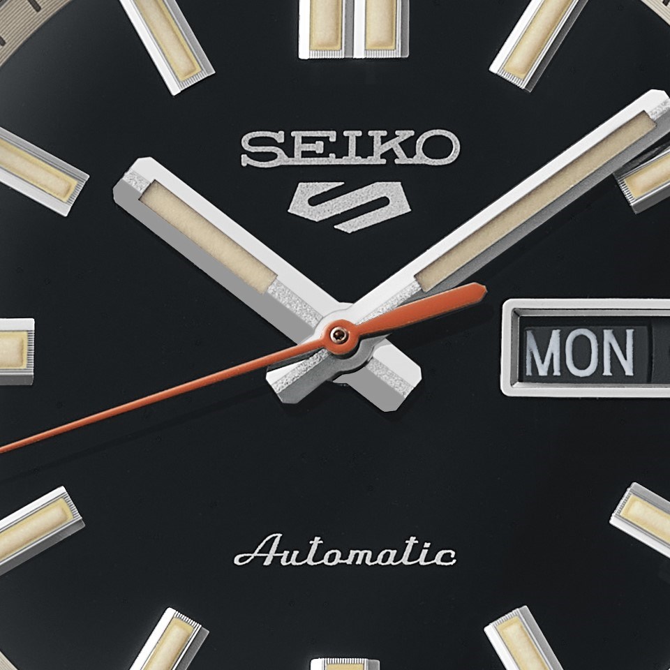 Under a semi-spherical glass, the dial features Lumibrite hands and indices, each diamond-cut with finely grooved lines on a ‘deep black wash’ colour dial. The hands are non-triangular and are wider, to enhance the vintage retro look whilst the orange second hand is inspired by the classic 70s design. With a metal dial ring, the bracelet features striking mirror and hairline finishing.