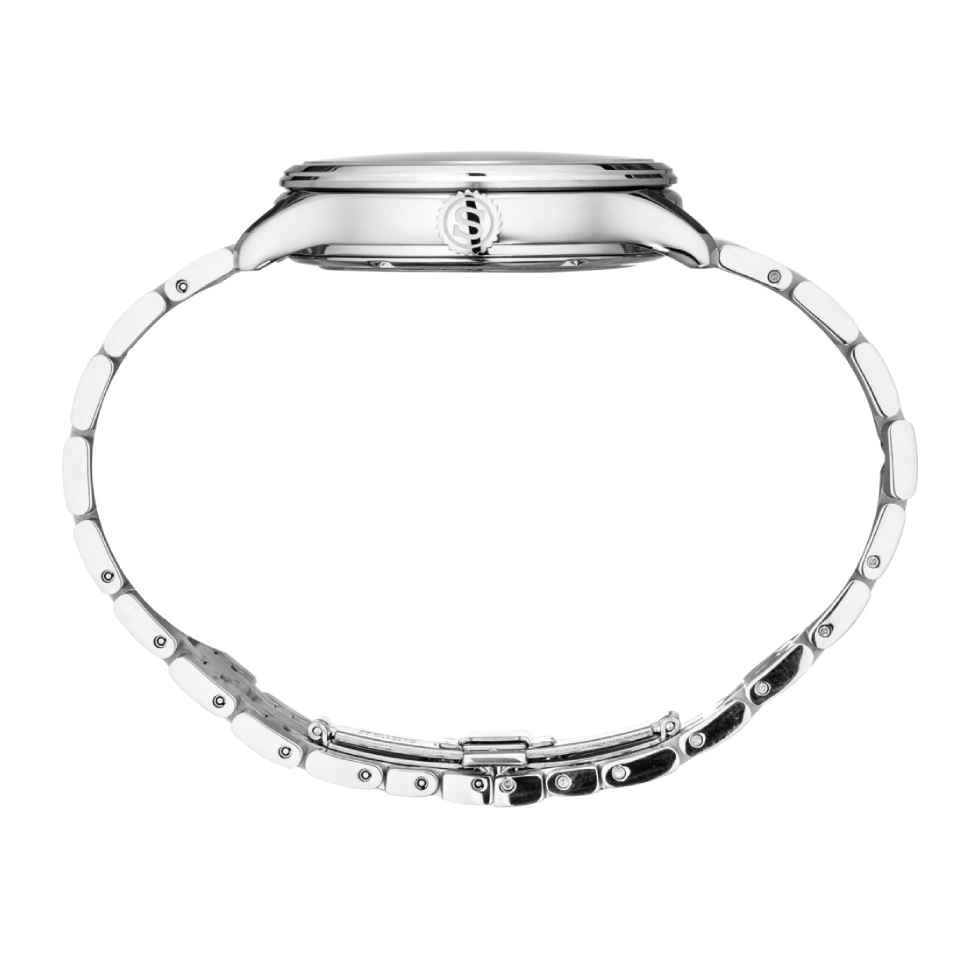 With a 40.5 x 12mm stainless steel case, silver tone baton hour markers, hands and an accent blue second hand, there is also a date display window. Finished with an automatic movement with manual winding and a stainless steel bracelet with a push button folding clasp. 50m water resistant.