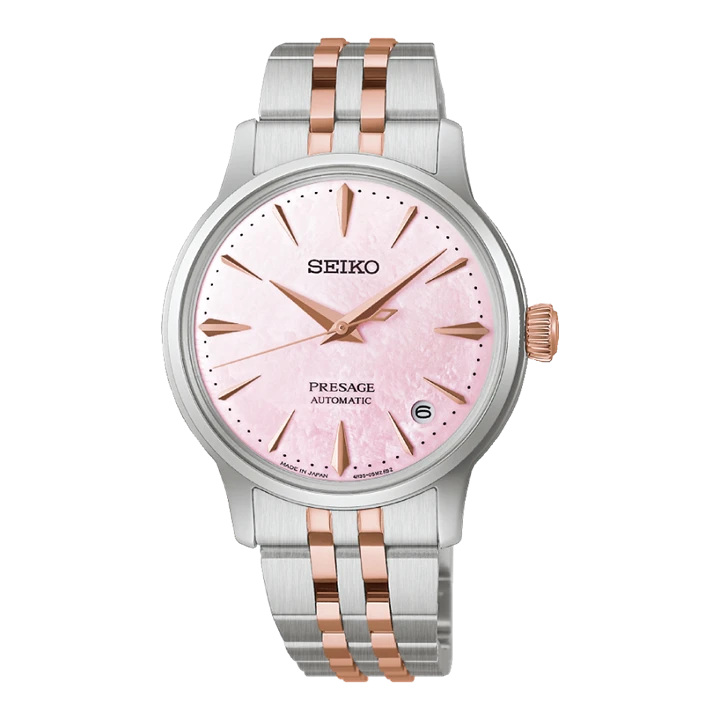 Compact in size with a 34mm case*, the light pink vertical gradation dial evokes the imagery of enjoying a refreshing cocktail whilst watching the Springtime Japanese cherry blossoms in full bloom. This is the first timepiece within the Cocktail Time collection to feature a mother-of-pearl dial. The elegant two-tone bracelet and rose gold-coloured crown, hands and indices are designed to enhance the soft pink tones. It is powered by an in-house 4R35 automatic calibre, accurate to +45 / -35 seconds per day with a 40-hour power reserve. 50m water resistant.