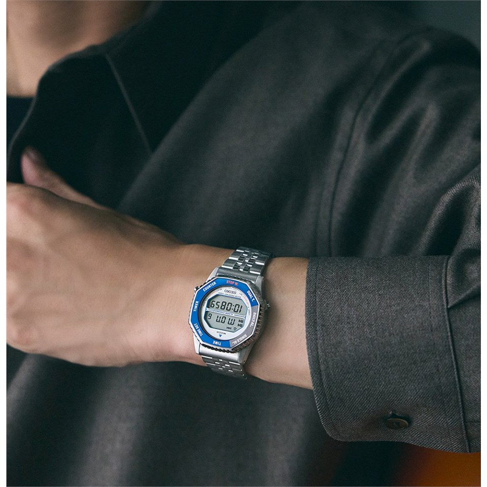 Designed with a bold blue bezel and stainless steel bracelet, it balances sporty style with practical performance.