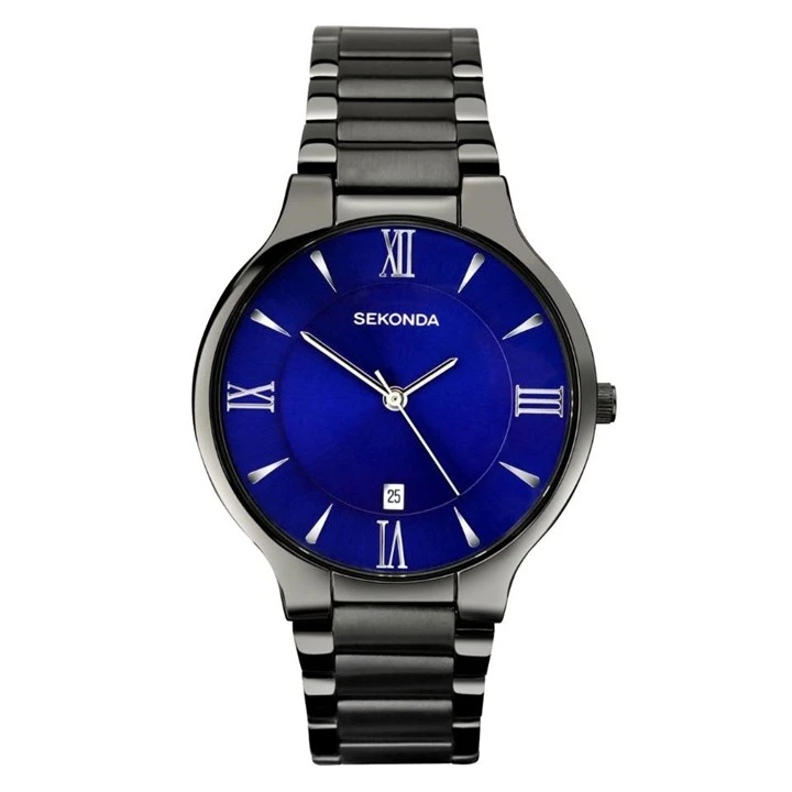 Sekonda 1140 Wilson - a smart looking Sekonda Equionx watch featuring robust matt and polished black ion plated styling. Fitted with an adjustable bracelet with fold over clasp, an attractive sea blue dial, silver tone roman numerals, hour bars and hands, plus useful date function at 6 o'clock.