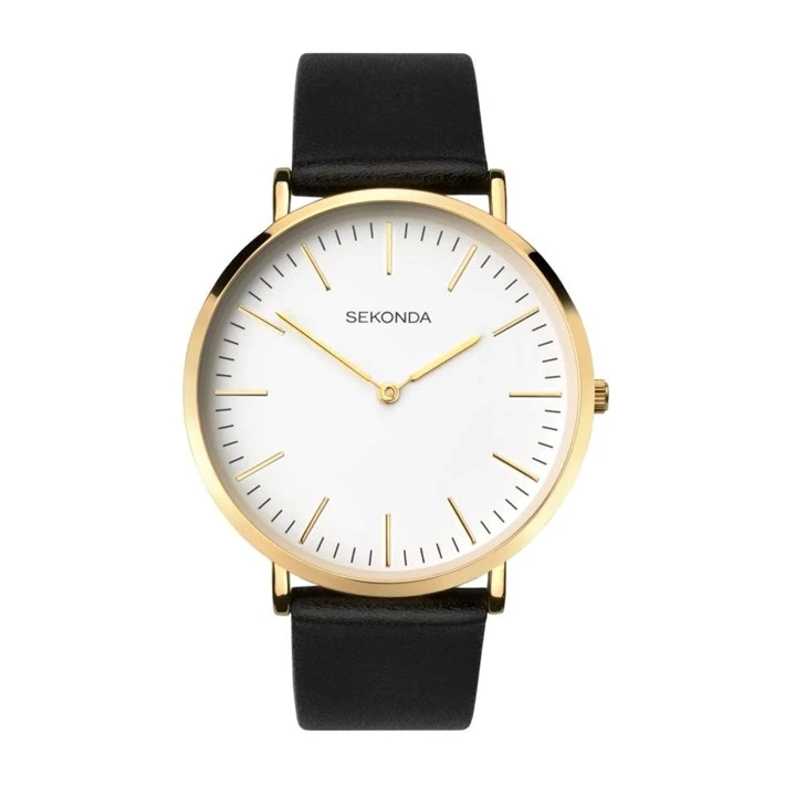 Sekonda 1344 - an elegant watch for men by Sekonda, with a minimalist look. A white dial is set off with gold-tone hands and batons and a gold-plated case. A black strap finishes the look.