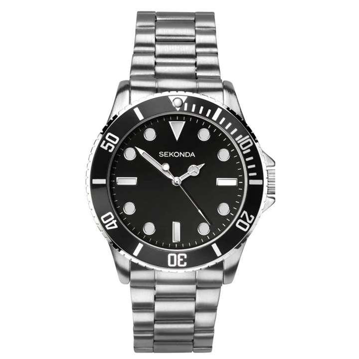 Sekonda 1501 Ocean - a classic men's Sekonda watch that combines black with steel tones, and features a diver's inspired rotating black bezel. The polished case links with a brushed finish steel bracelet with folding clasp.
