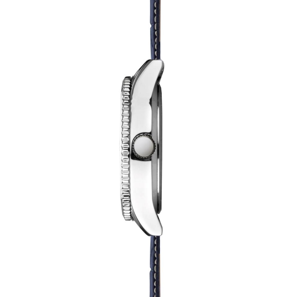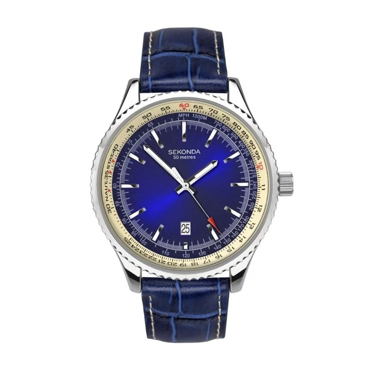 Sekonda 1575 - with complimentary blue leather upper strap and dial, this men's watch from Sekonda is a handsome timepiece. The stainless steel backed case has a notched bezel and houses a tachymetre dial with silver baton hour markers and hands and an accent red tip on the second hand.