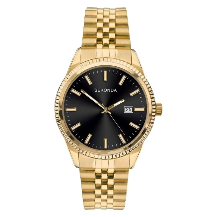 The gold plated case boasts a notched bezel and houses a black dial with luminous hour bars and hands, plus a handy date panel at 3 o'clock. The adjustable bracelet is fastened with a foldover clasp.