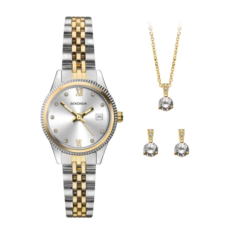 Sekonda 2674G Two Tone Watch, Necklace And Stud Earrings Gift Set - W32452