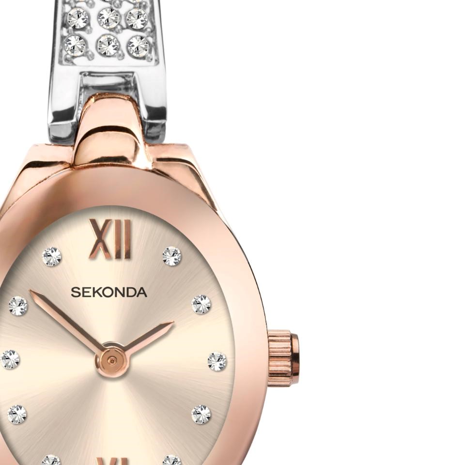 Sekonda 2924G Gift Set - this lovely rose gold plated oval watch is set onto a sparkly, crystal set semi-bangle bracelet with crystals also used for hour markers on the dial. The watch is complimented by the matching bangle, pendant and earrings that make up this wonderful gift set.