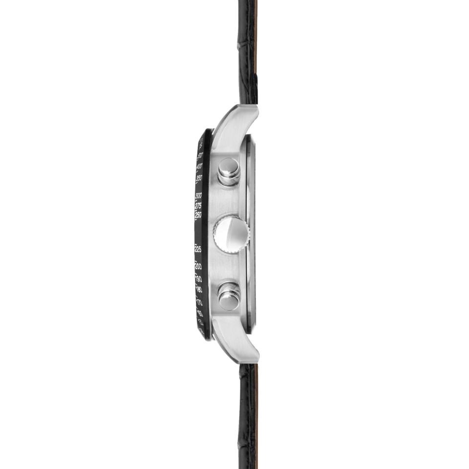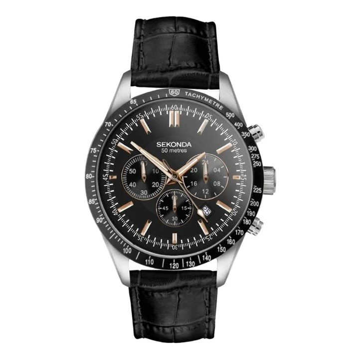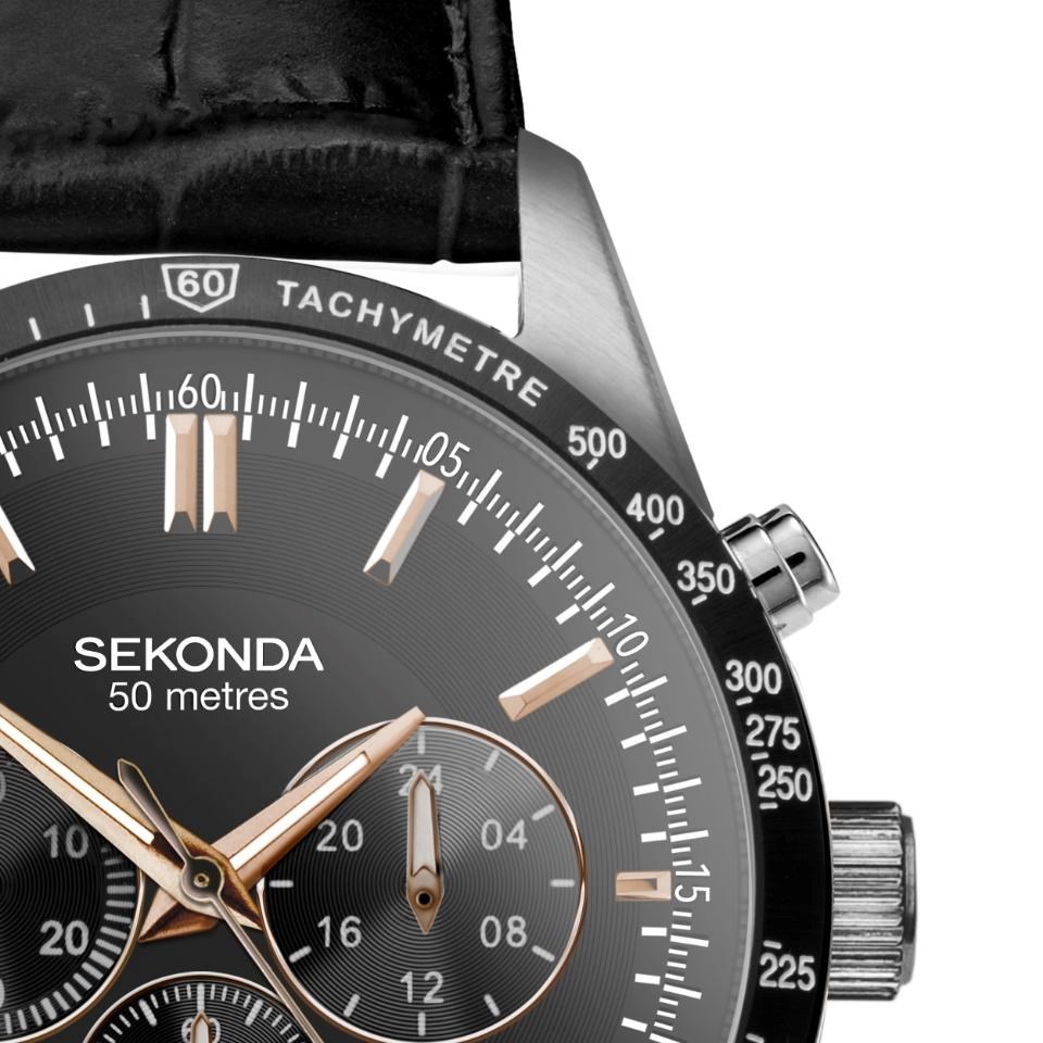Sekonda 30017 Velocity - this Sekonda chronograph watch combines a stainless steel case and black leather strap with a traditional buckle. It has a black analogue dial with rose tone hour markers, luminescent hands, date display, chronograph sub-dials and a tachymeter scale which are protected beneath a mineral crystal glass.