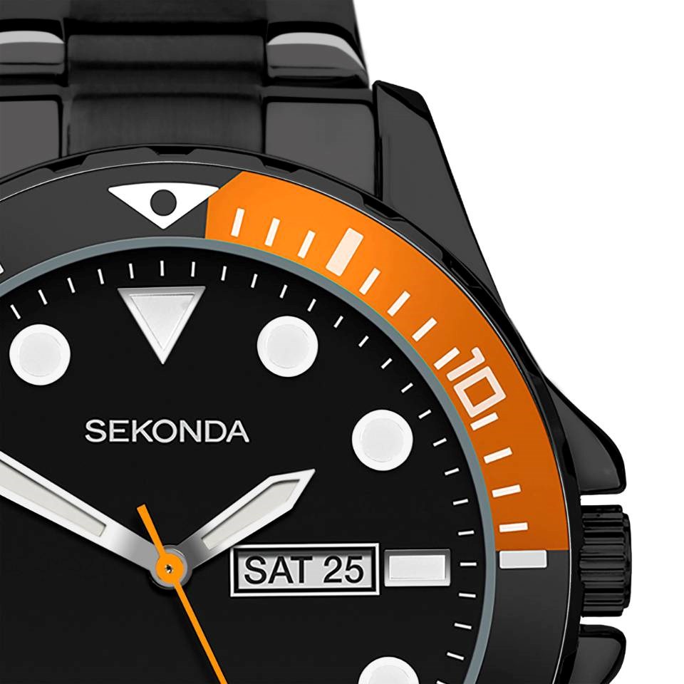 Sekonda 30120 - this stylish watch from Sekonda has a black alloy case with a fixed black and orange bezel and black dial. The watch is fastened with an ion-plated black, stainless steel bracelet.
