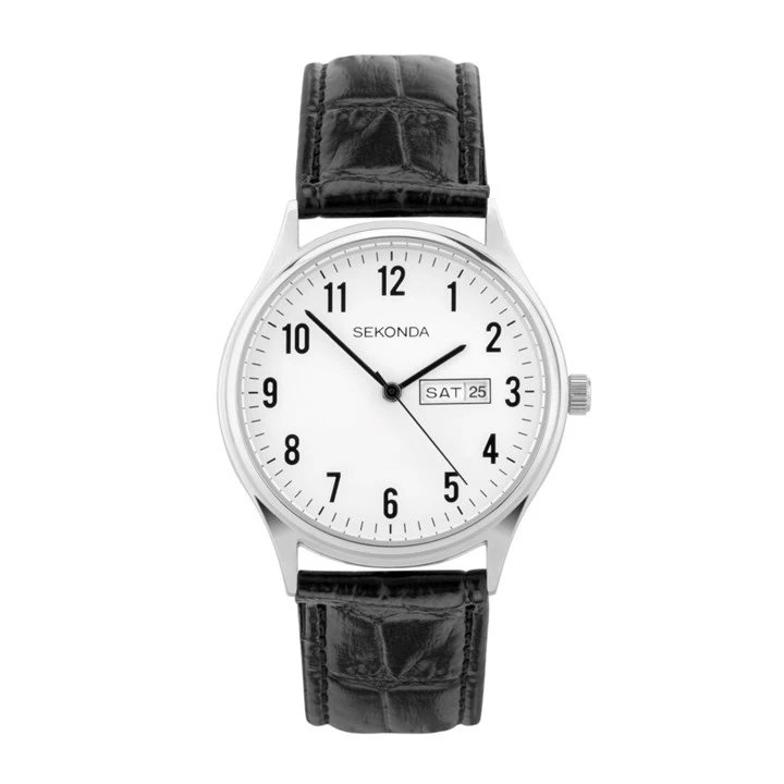 Sekonda 30121 Hall - the clear and easy-to-read watch from Sekonda has a silver tone case with a white dial, black numberals and hands plus a day/date display. Fastened with a black croco grain leather strap.