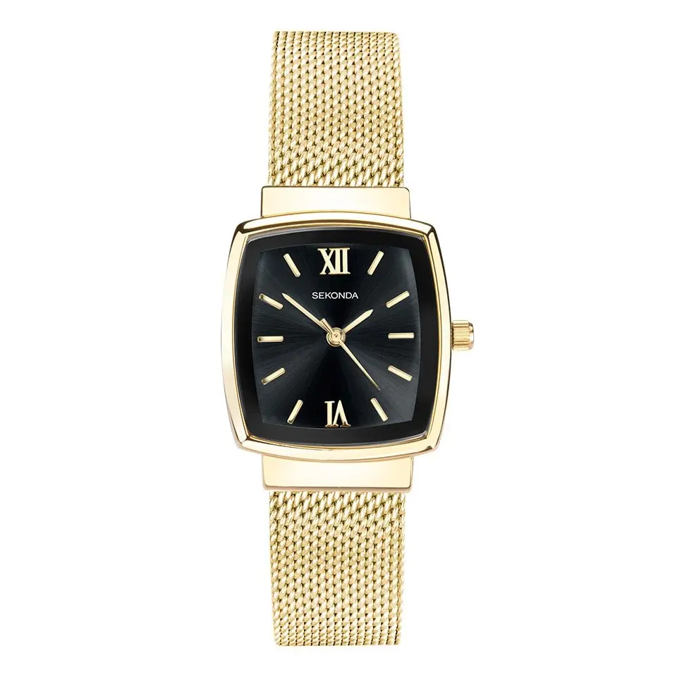 Sekonda 40383 - this traditional ladies watch from Sekonda features a gold coloured stainless steel backed case with a black sunray dial with raised gold tone roman numerals. Fastened with a gold coloured stainless steel mesh bracelet.