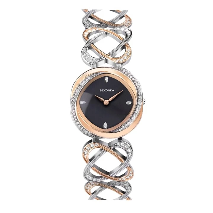 Sekonda 40508 Hidden Hearts - a pretty two tone Sekonda watch featuring a black dial, silver and rose dial accents, a stone set twisted bezel and a matching stone set bracelet with open elipse links.