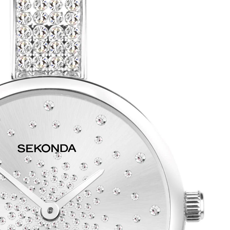 Sekonda 4674 - the watch has a round, ion-plated silver alloy case with a silver glitter dial, stone set with 130 crystals. The watch is fastened with an ion-plated silver brass semi-bangle bracelet embellished with crystals and fastened with a folding clasp.