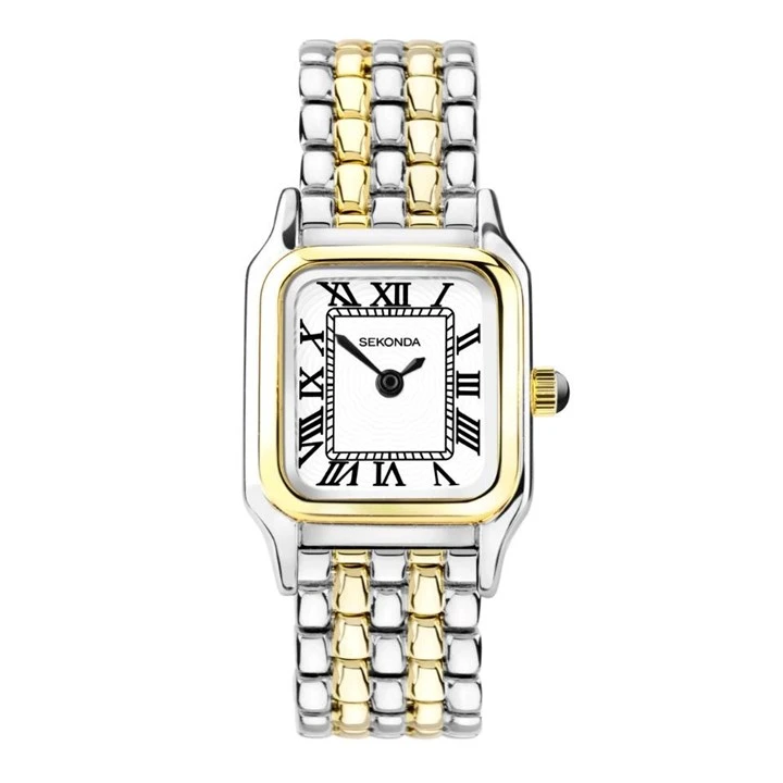 Sekonda 40658 Monica - this traditional two tone Sekonda Monica watch features a square case housing a white dial with black roman numeral hours markers and hands. Finished with a bracelet with a folding clasp.