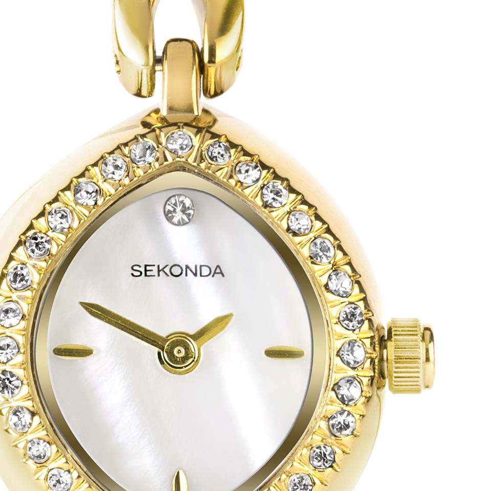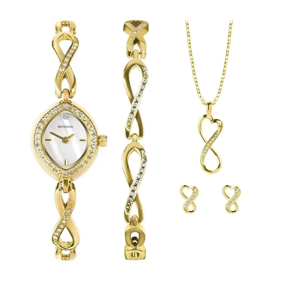 Sekonda 49057 Bracelet, Necklace, Earrings and Watch Gift Set - this lovely gift set from Sekonda features an oval, stone set, ion-plated gold case watch with a white mother of pearl dial. Fastened with an ion-plated gold, stone set bracelet with a jewellery clasp. The watch has been paired with matching, ion-plated gold bracelet, stone set pendant with stainless steel chain and stone set earrings.