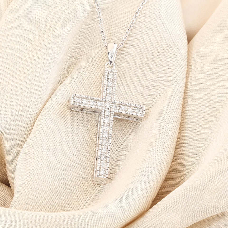 Beautifully refined and full of sparkle, this 25 x 16mm sterling silver cross is meticulously encrusted with tiny, dazzling lab-grown diamonds. It is a timeless, everyday piece that combines deep meaning with radiant brilliance.