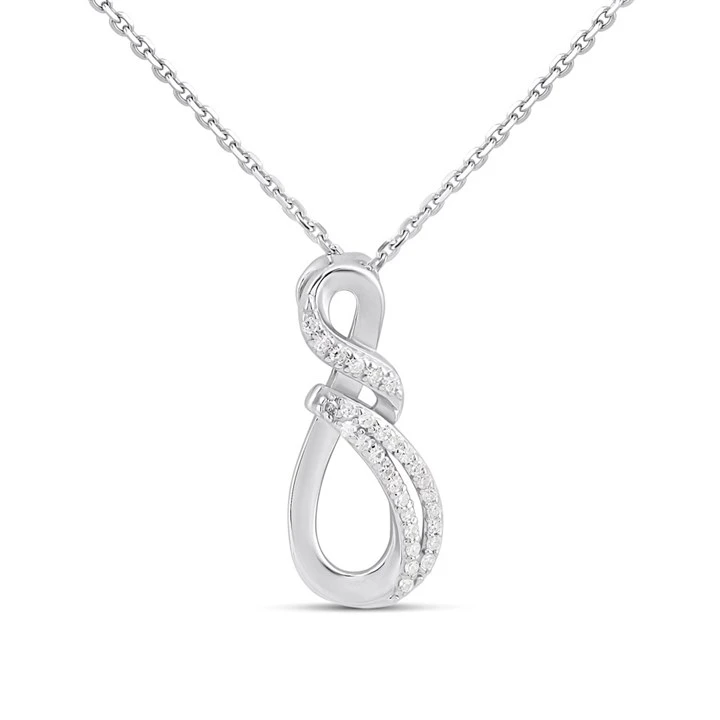Get that perfect everyday sparkle with this 20mm sterling silver pendant with a sleek, intertwined loop silhouette, meticulously set with 1/10ct lab-grown diamonds for maximum fire and style.