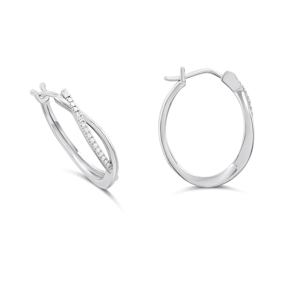 Elevate your everyday style with these unique silver earrings. The 22mm elegant oval hoops showcase a stylish crossover element, beautifully detailed with brilliant, ethically sourced lab-grown diamonds for maximum impact. With hinge and snap fastening.