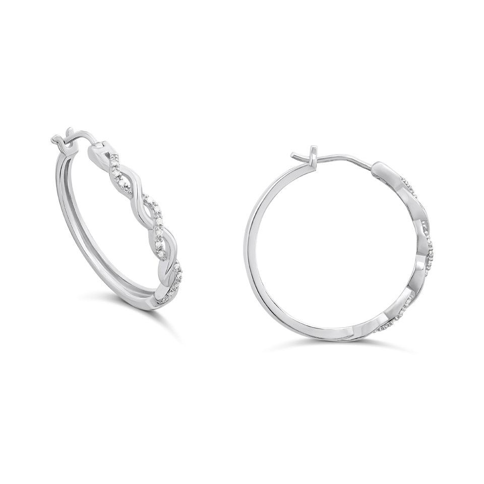 A fresh take on the classic round hoop, this 25mm silver design showcases a beautiful crossover element, with lab-grown diamonds set along the curve to add luxurious fire and light to your everyday look. With a hinge and snap fastening.