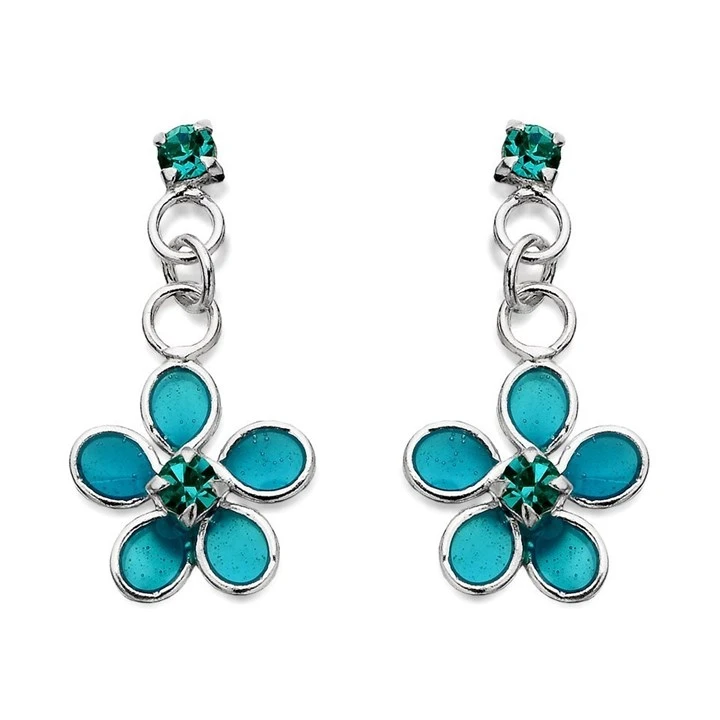 Silver Aqua Blue Crystal Flower Drop Earrings - 15mm drop - F1136