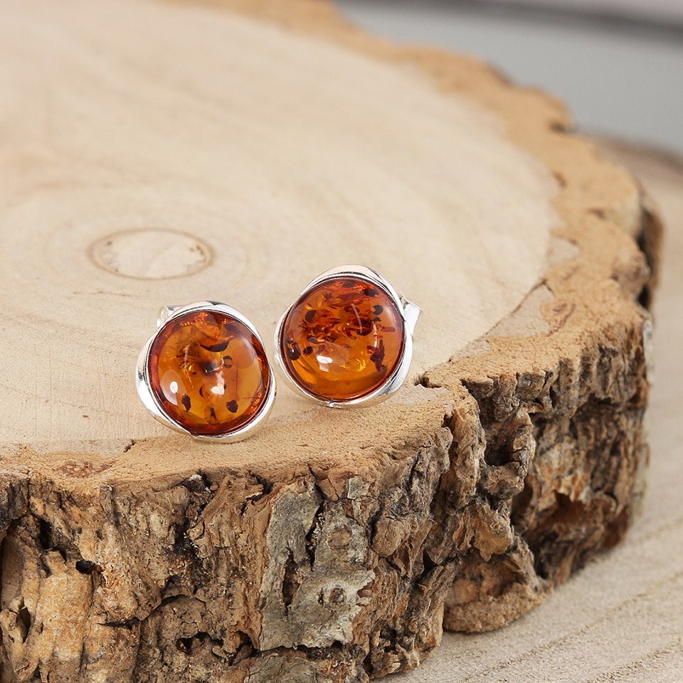 These 10mm sterling silver stud earrings feature a stunning rich genuine Cognac amber stone. With their earthy warmth and timeless elegance, these earrings add a sophisticated, nature-inspired touch to any look. With butterfly fittings.