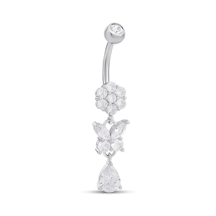 Silver Crystal Cluster Butterfly Pear Drop Belly Bar - J3513