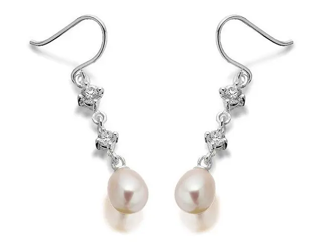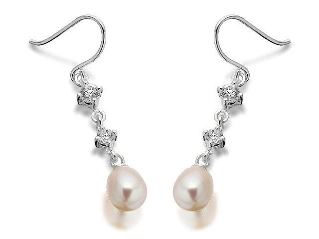 Silver Cubic Zirconia And Freshwater Pearl Hook Wire Earrings - 30mm - F0776