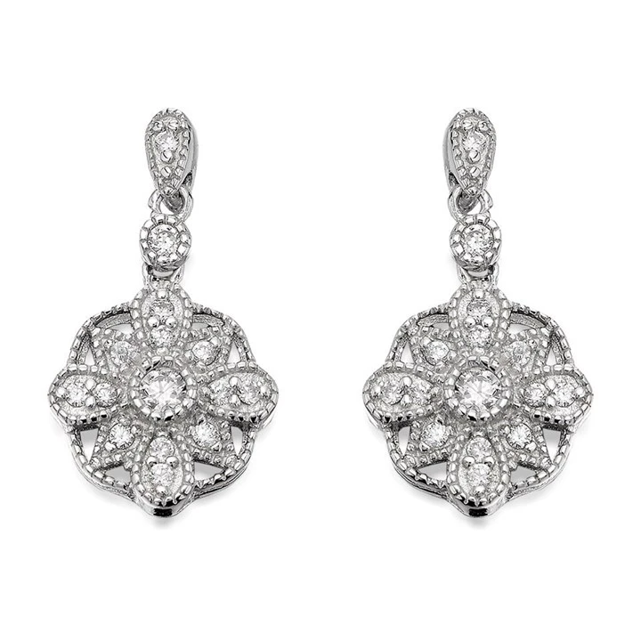 Silver Cubic Zirconia Flower Drop Earrings - 18mm drop - F1172