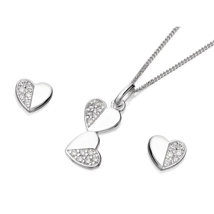 Silver Cubic Zirocnia Heart Stud Earring And Pendant Set - GS0457