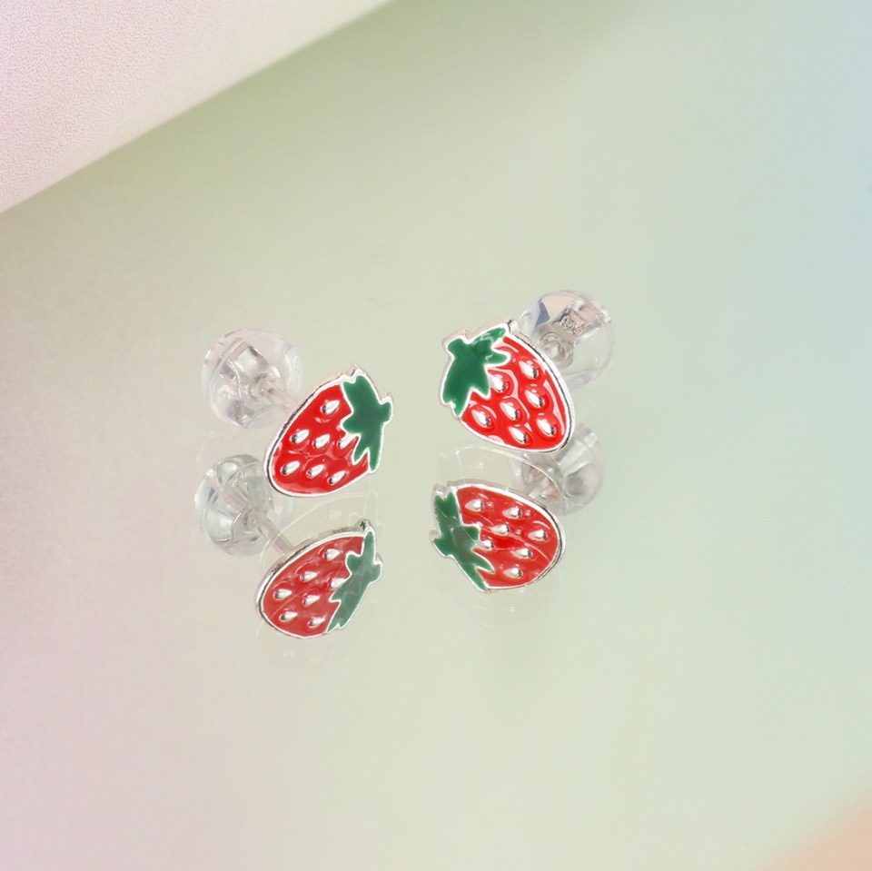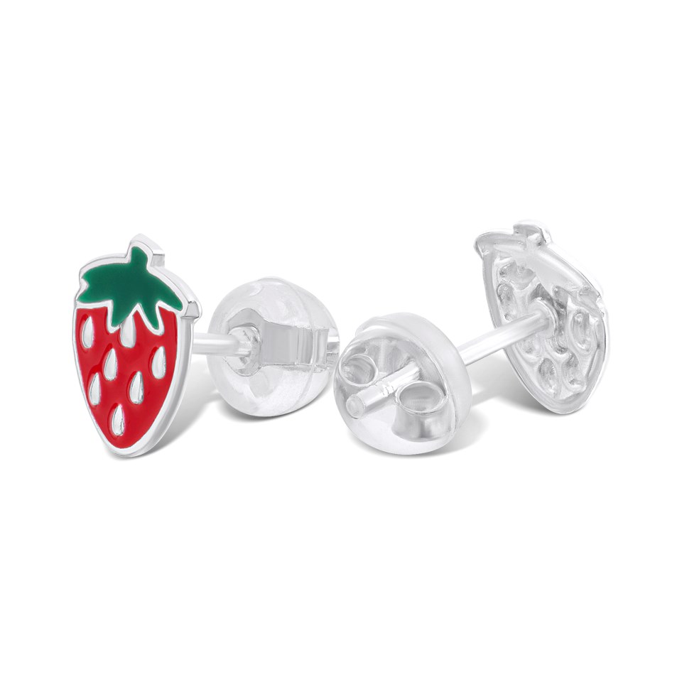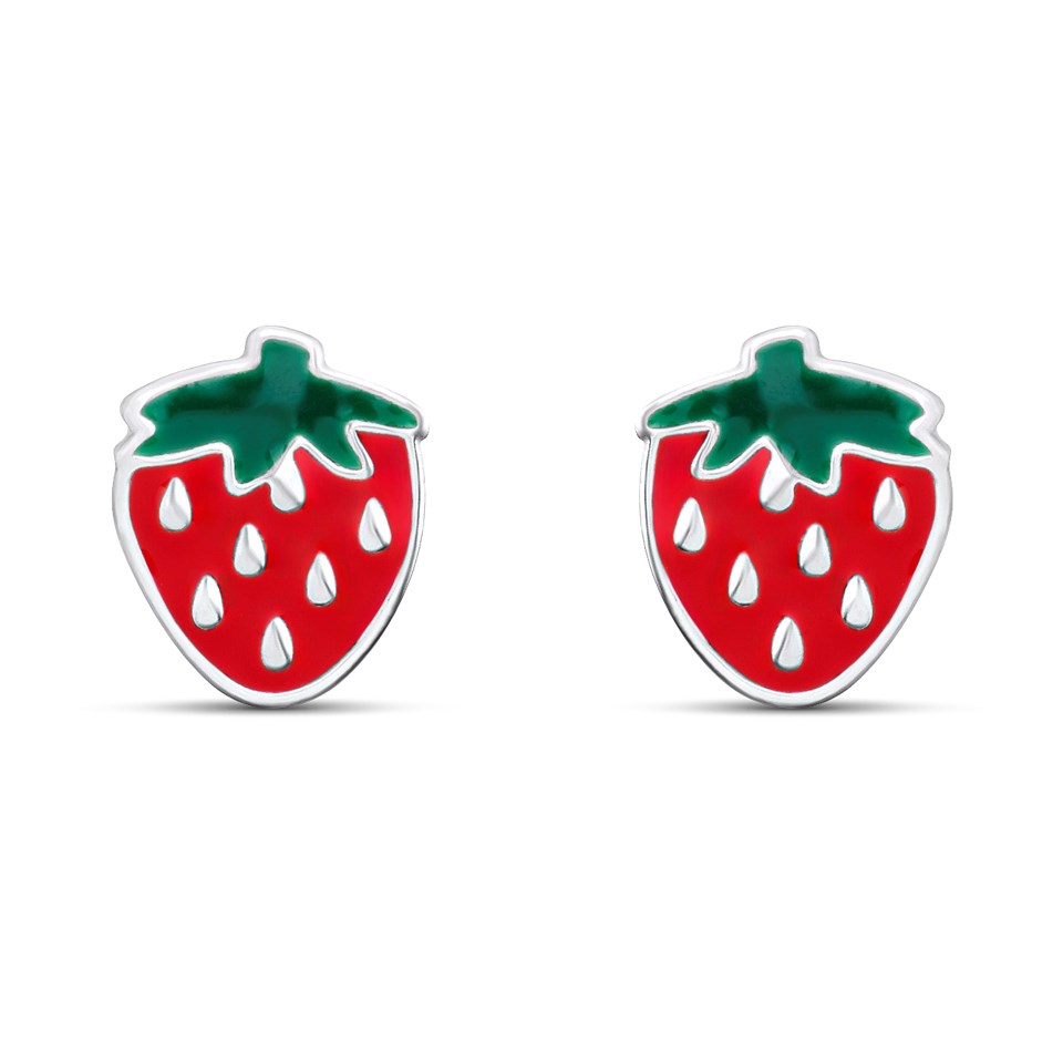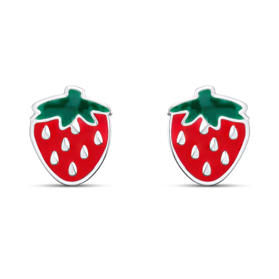Silver Enamel Strawberry Stud Earrings- 7mm - F0163