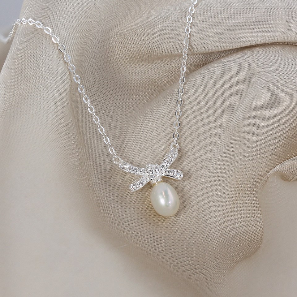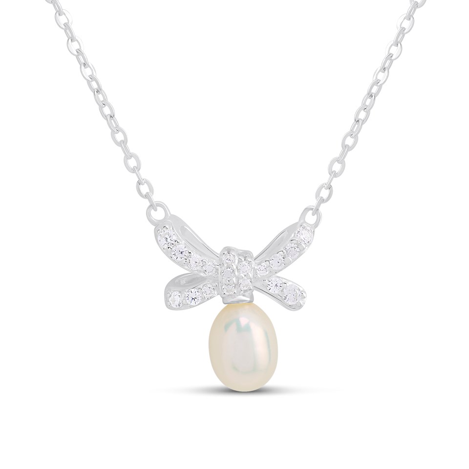 Silver Freshwater Pearl CZ Bow Necklet - F34119