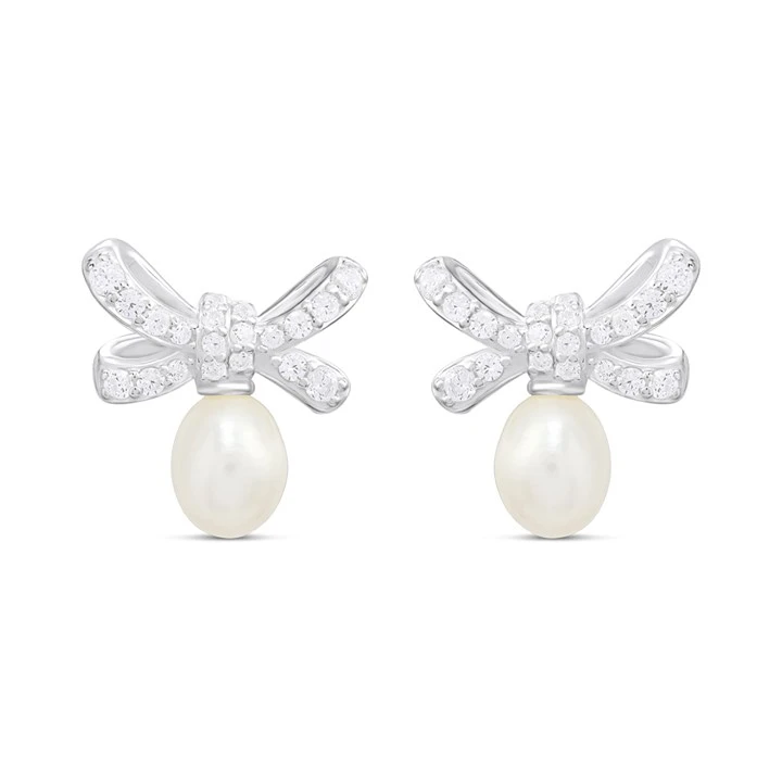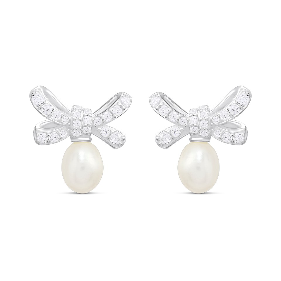 Silver Freshwater Pearl CZ Bow Stud Earrings - F04239