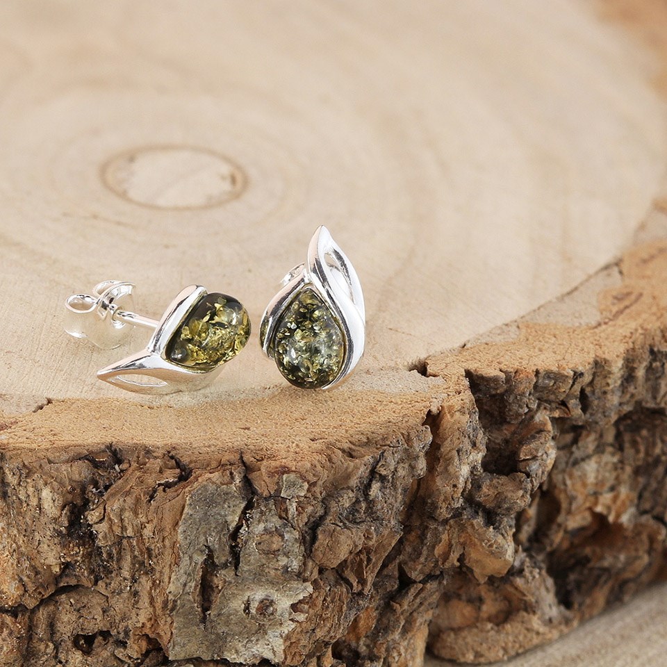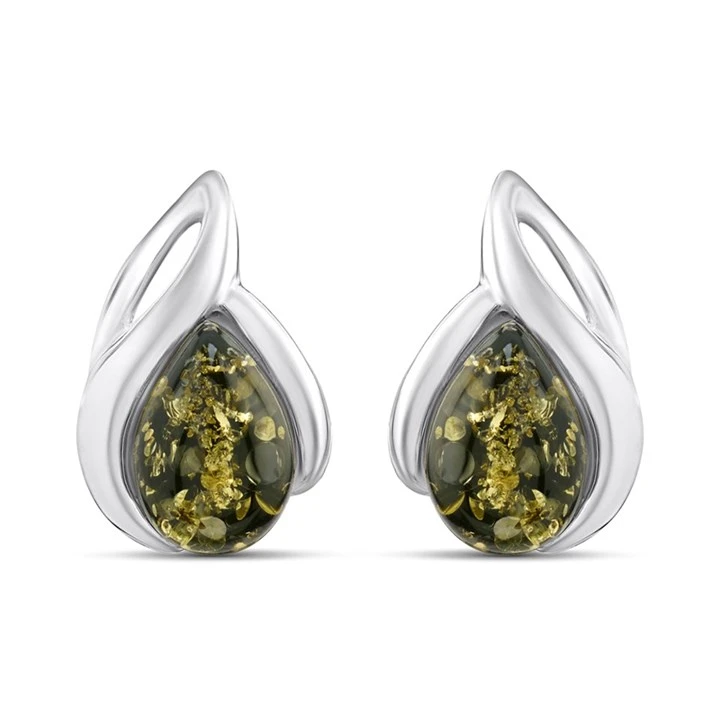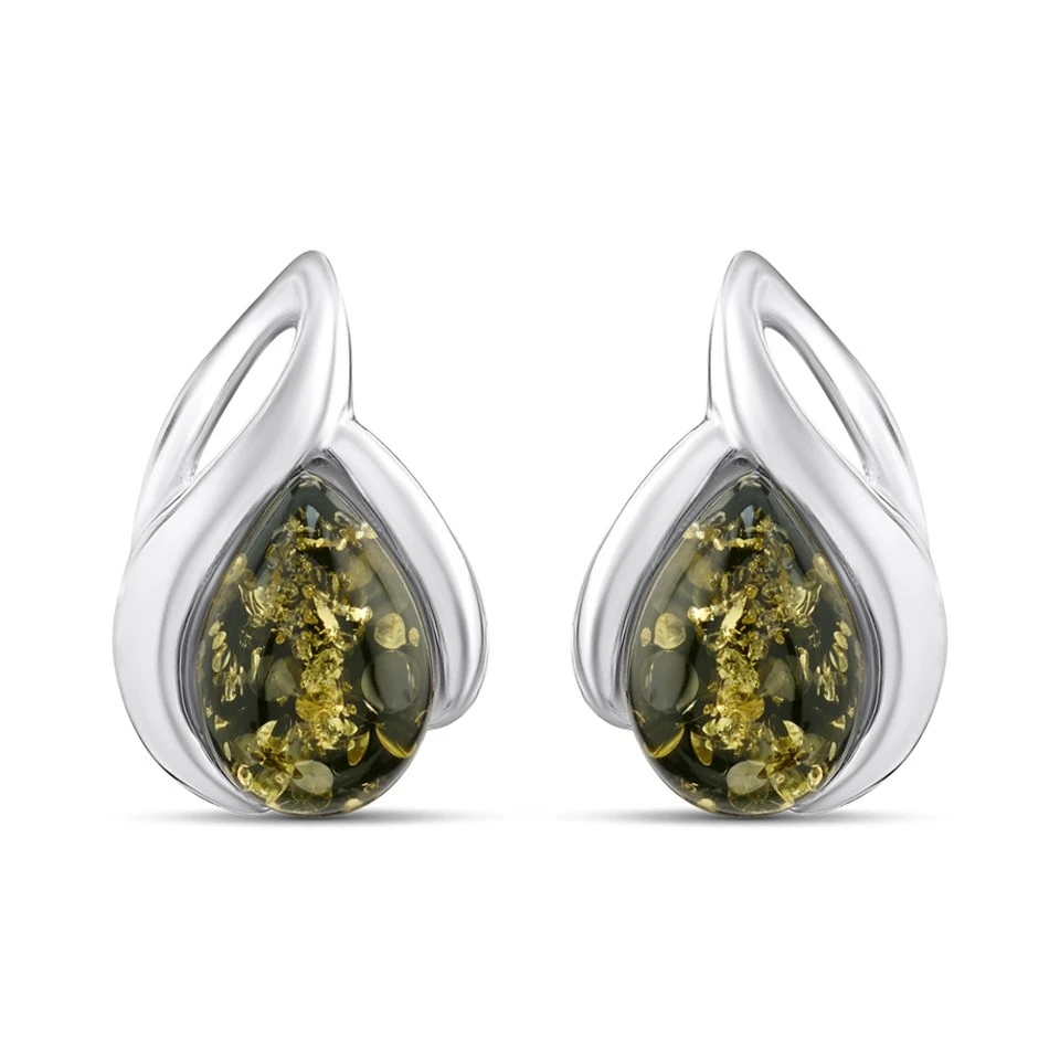 Silver Green Amber Teardrop Stud Earrings - F04228