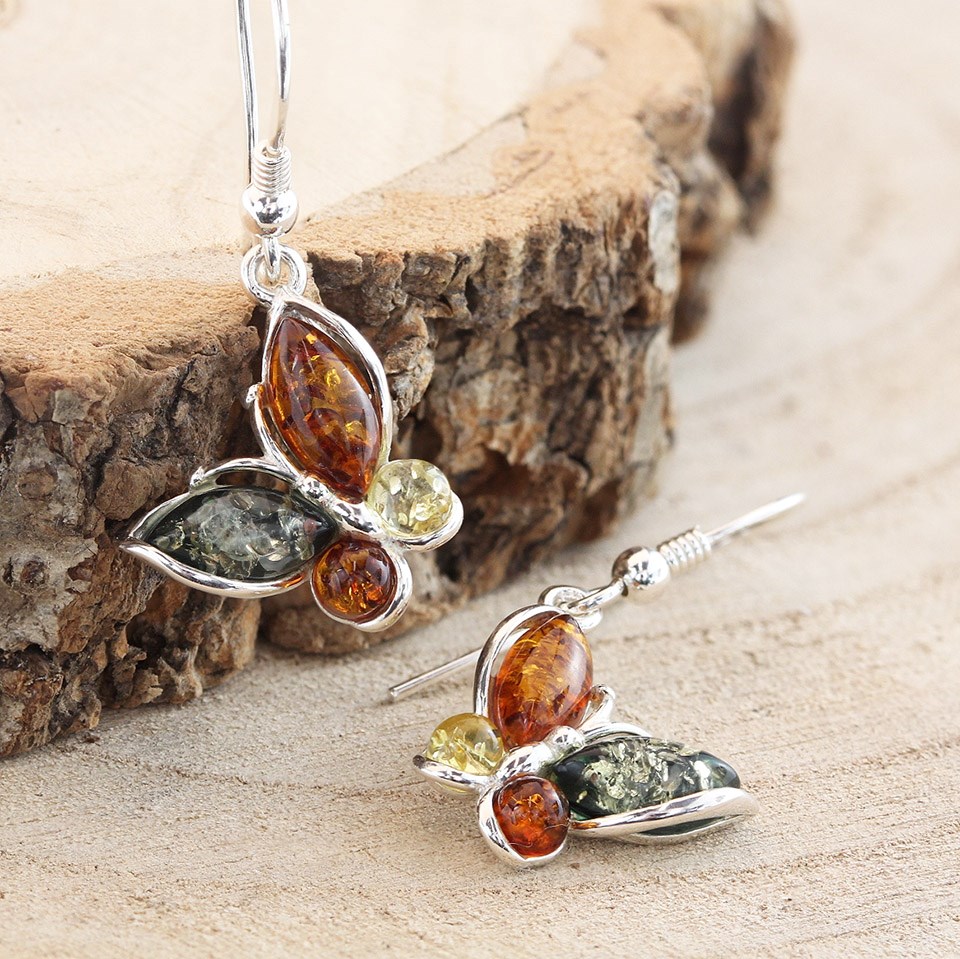 Silver Mixed Amber Butterfly Hook Wire Drop Earrings - F0717