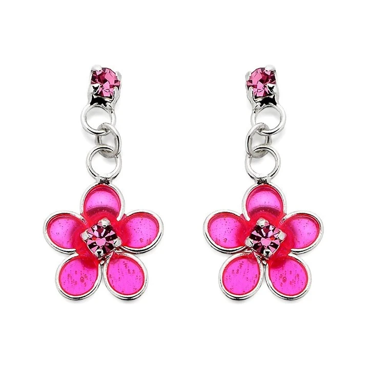 Silver Pink Crystal Flower Drop Earrings - 15mm drop - F1134