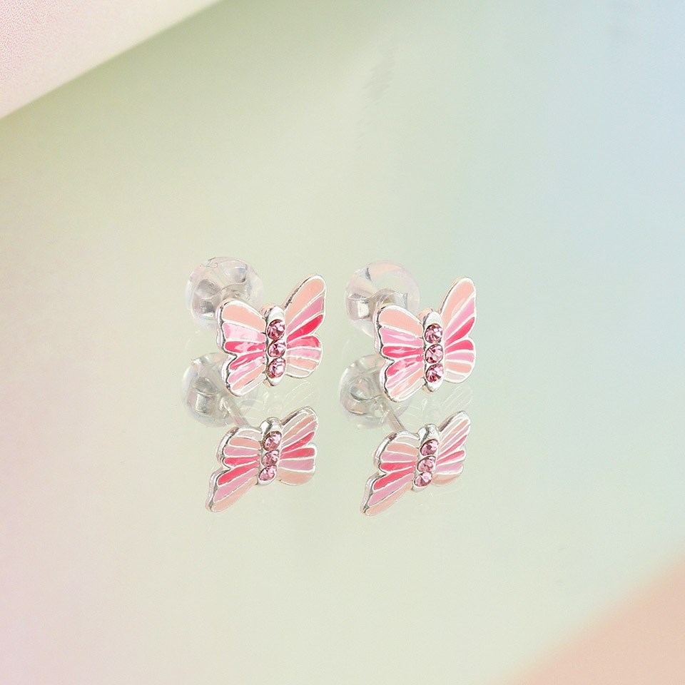 Silver Pink Enamel Crystal Butterfly Earrings - F04235