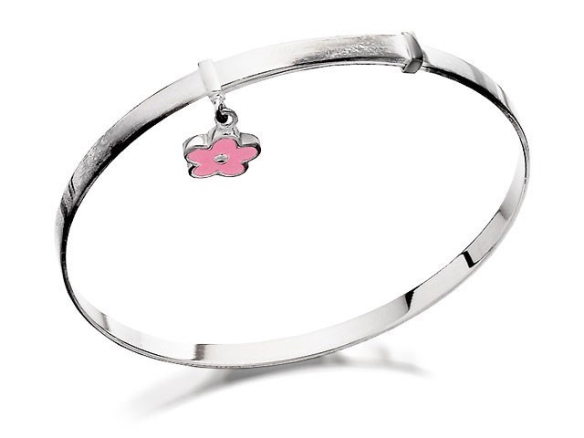 Silver Pink Enamel Flower Charm Expanding Children's Bangle - F2638