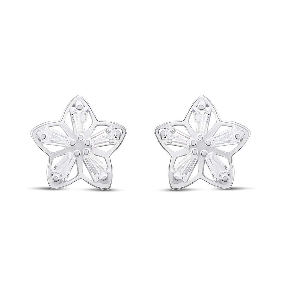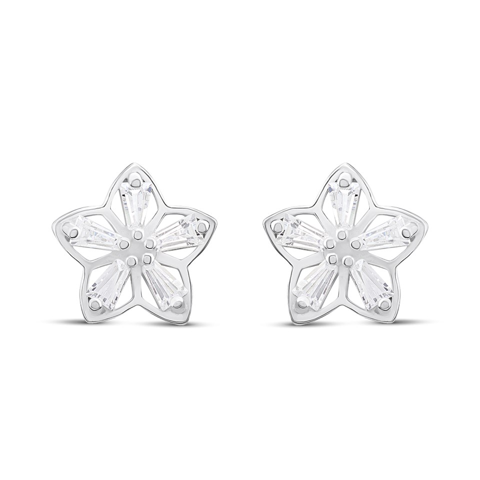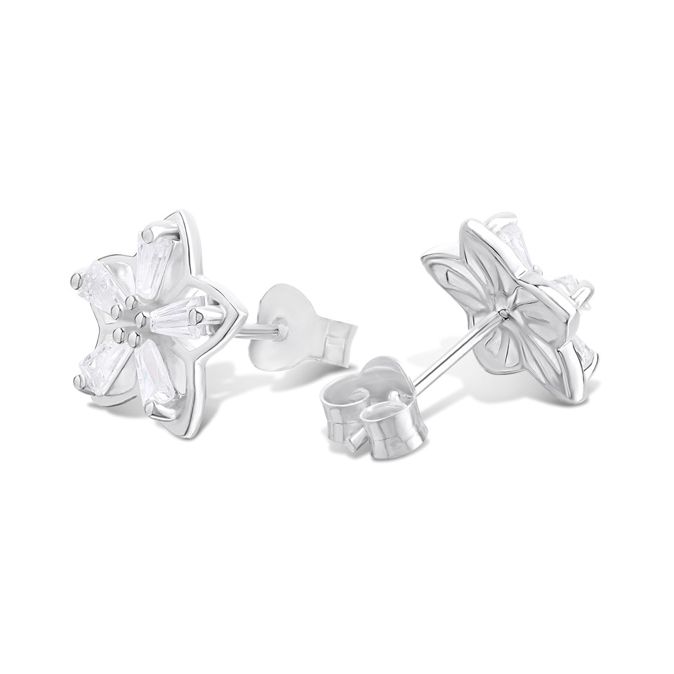 Silver Tapered Baguette CZ Flower Stud Earrings- 10mm - F03112