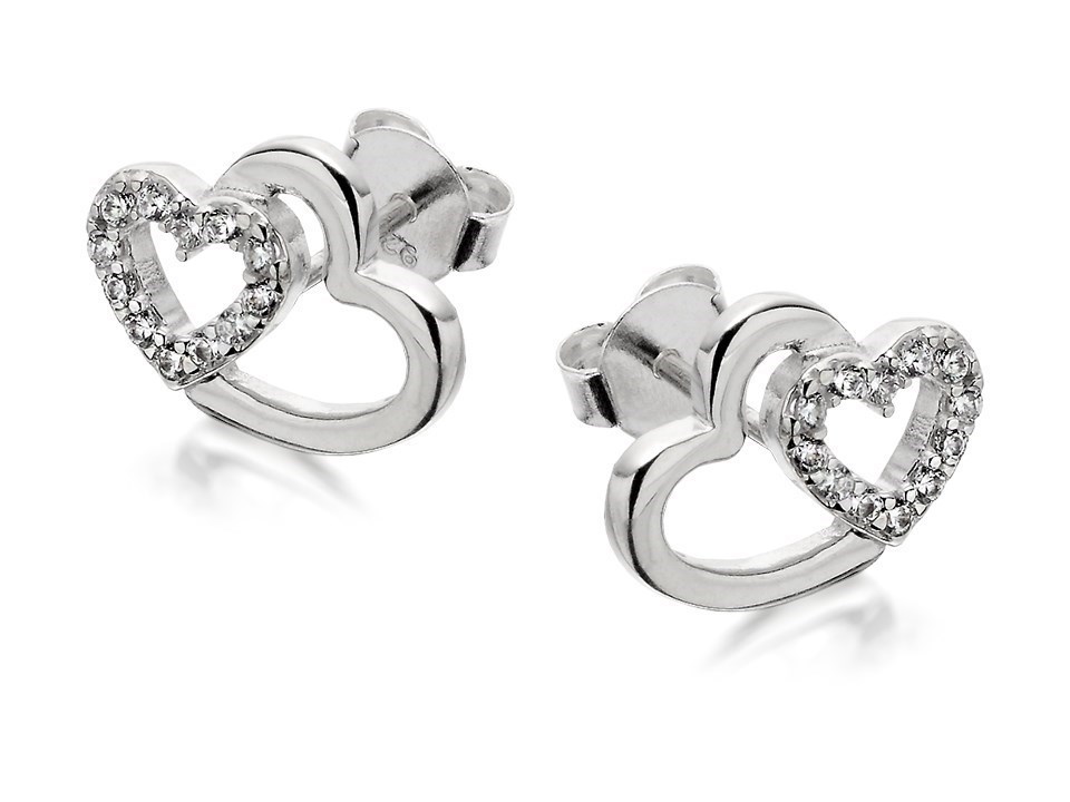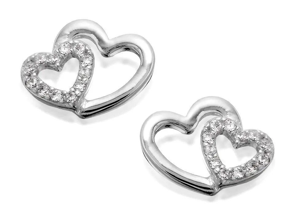 Silver Two Hearts Cubic Zirconia Stud Earrings - 12mm - F0453