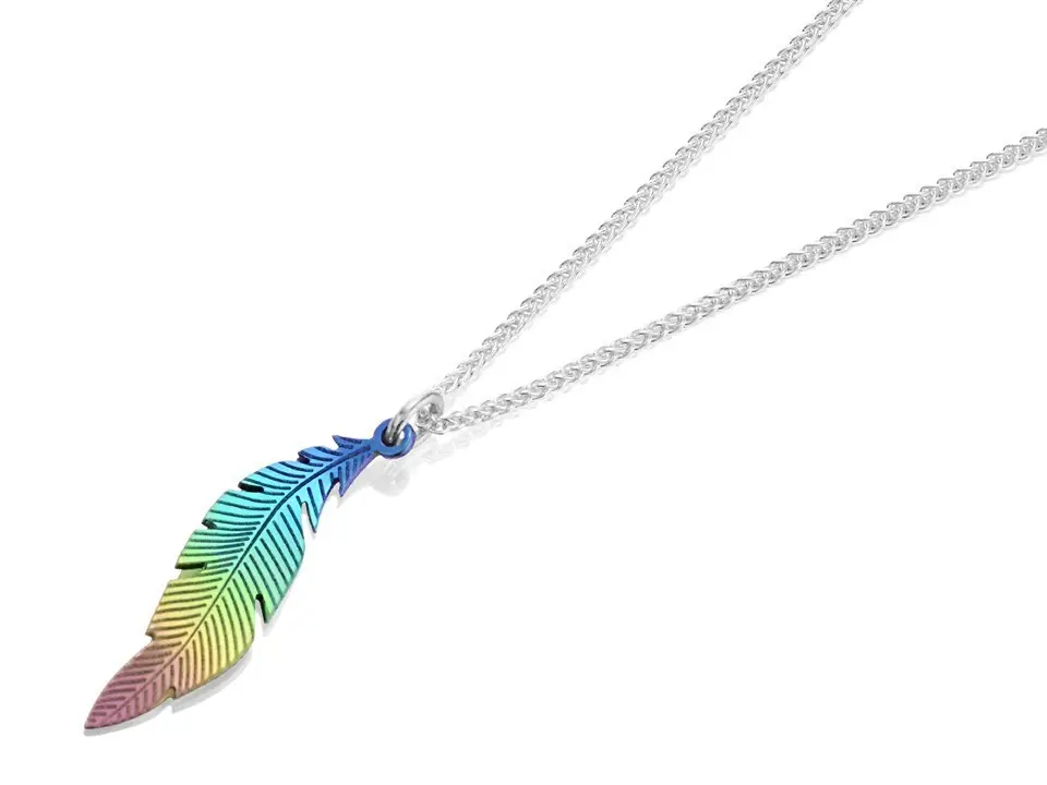 Ti2 Titanium Curved Rainbow Feather Pendant And Silver Chain - J1903
