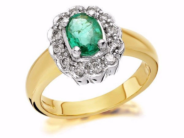 This dramatic love story can only have a dramatic ring to match – Edward chose a 19.77ct emerald gemstone surrounded by a halo of single diamonds set into yellow gold. The band was made personal when Edward had the words "we are ours now" engraved on the band.