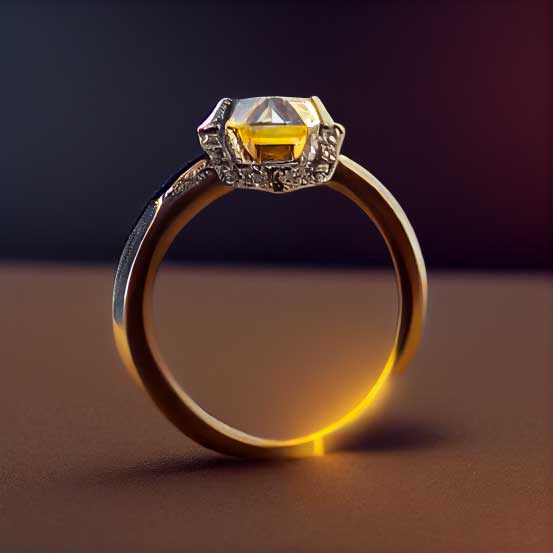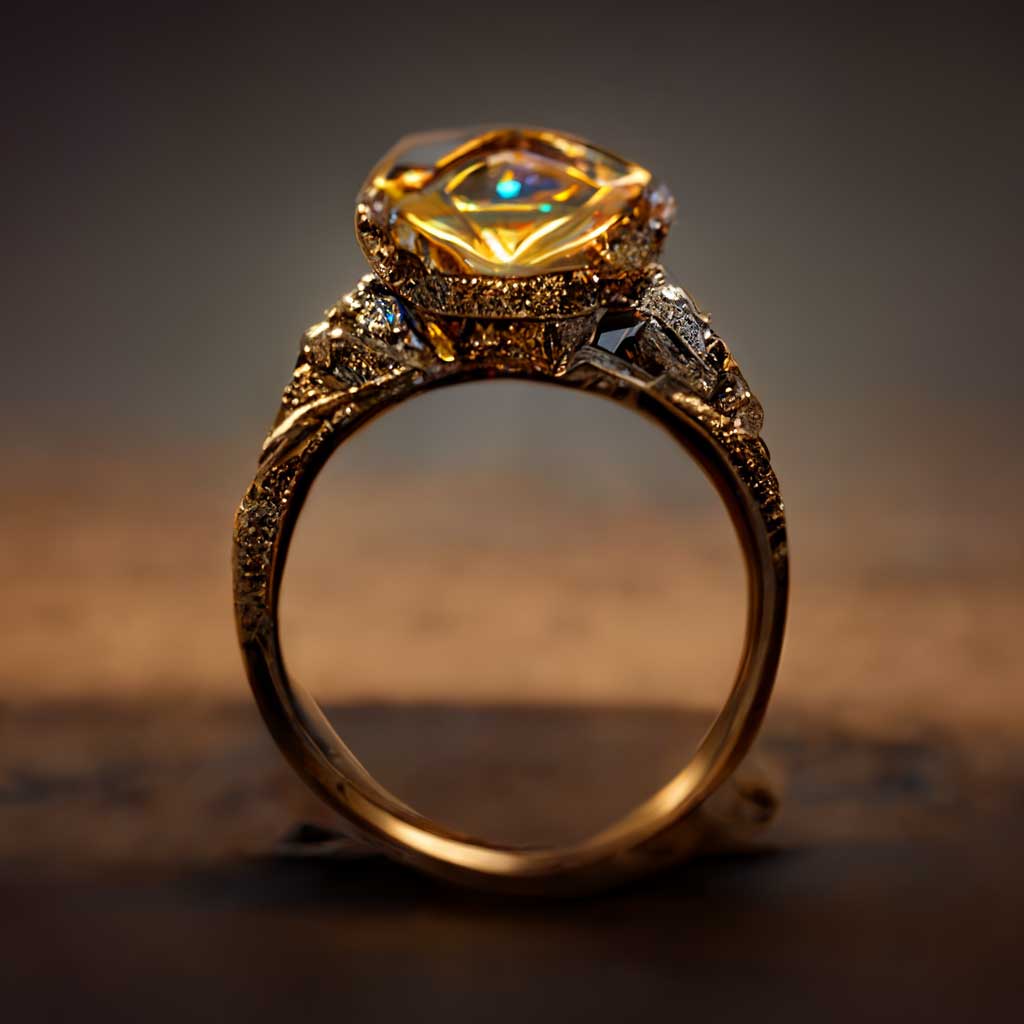 Taking inspiration from ancient Egyptian architecture and design, an AI-designed engagement ring representing Egypt incorporates ornate golden banding with a warm yellow gemstone, reflecting the grandeur of Egyptian history.