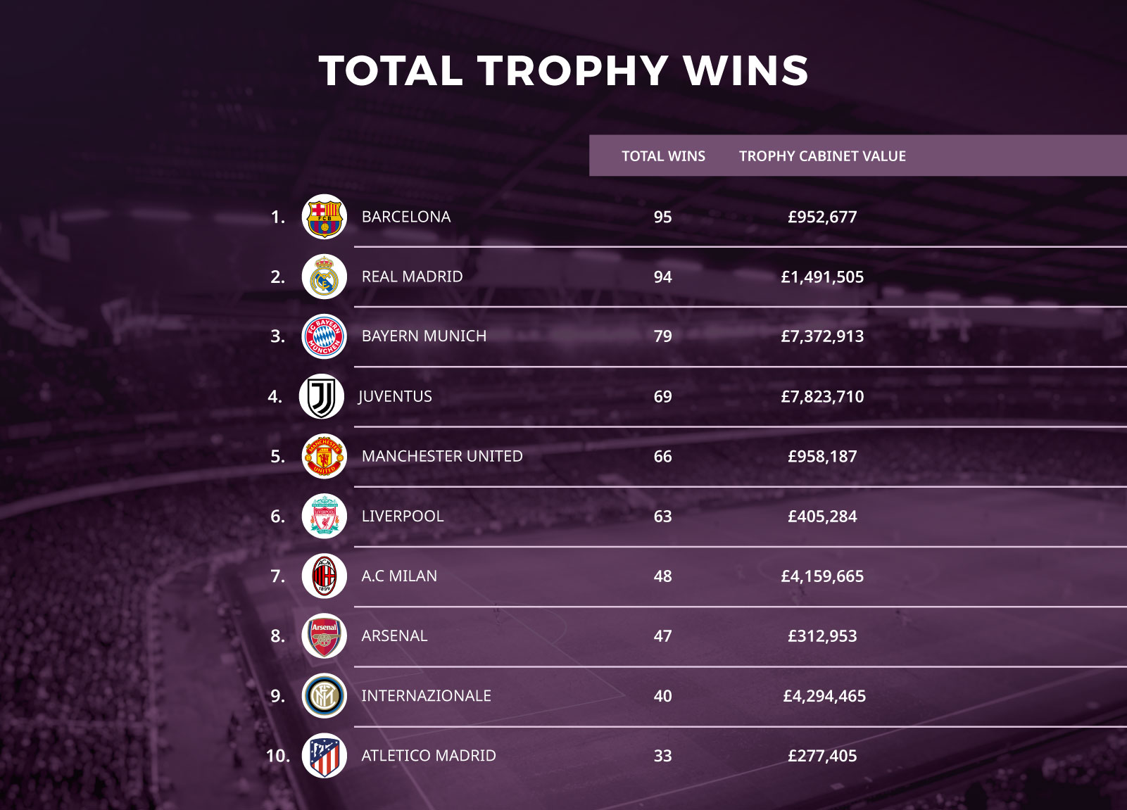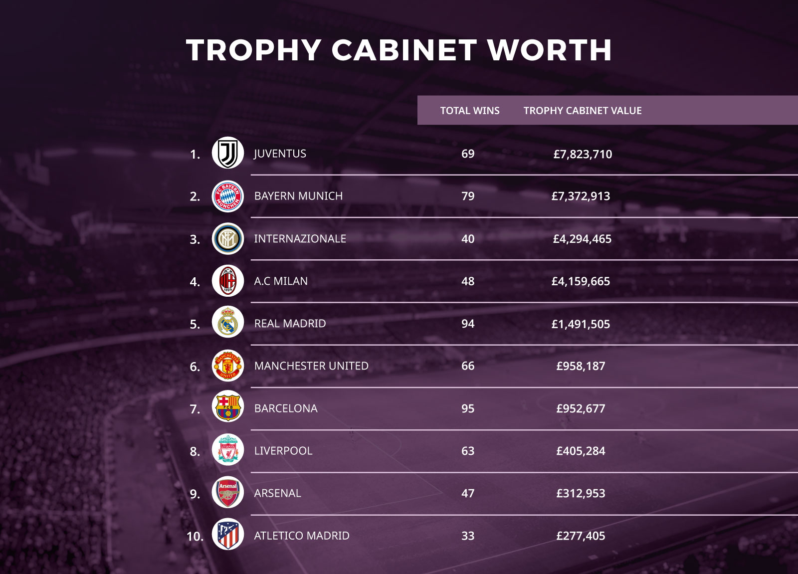The current Serie A champions Inter Milan rounds off the top three, with a trophy cabinet boasting £4,292,465 worth of prizes, just ahead of their fierce rivals AC Milan (£4,159,665).
