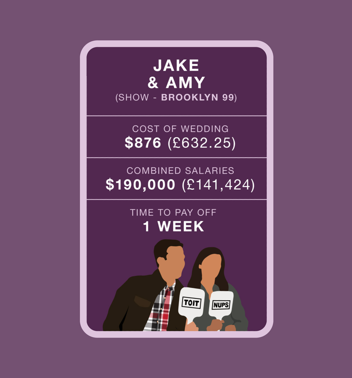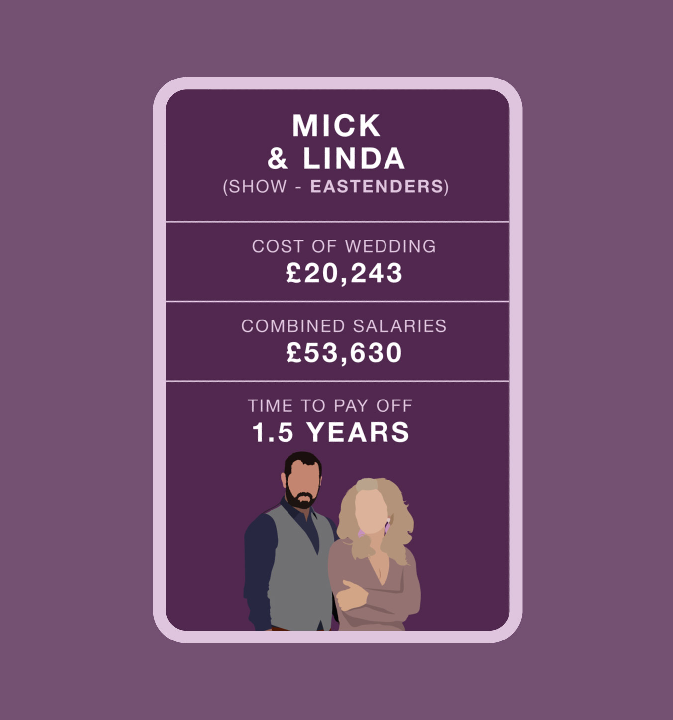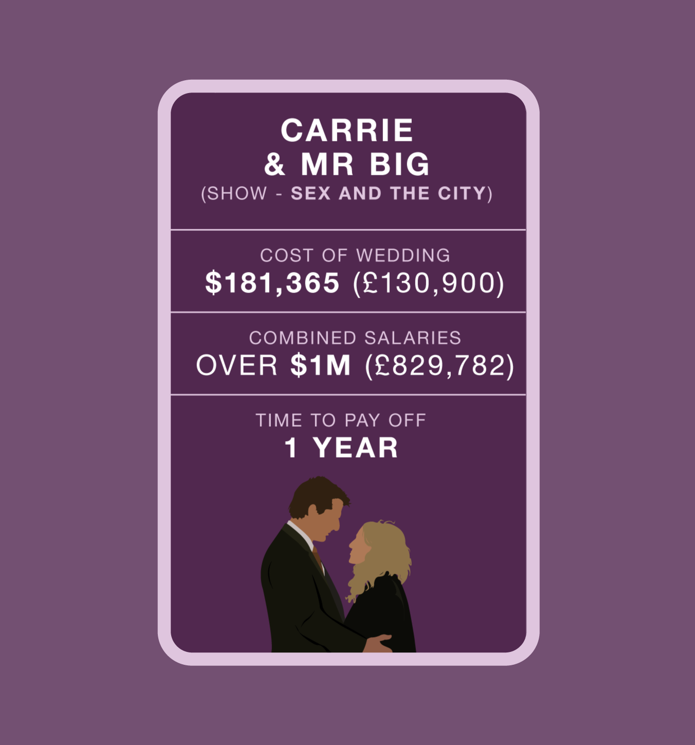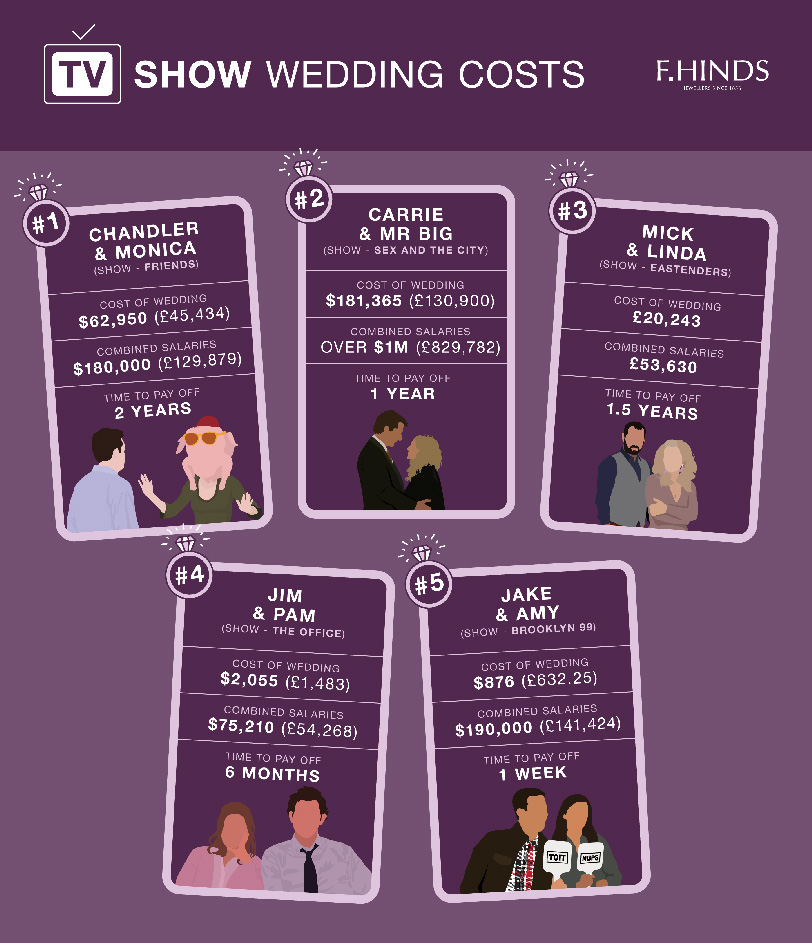 We researched elements such as venue, wedding rings, catering, wedding outfits and “extra” expenses of five iconic fictional weddings, from Friends to EastEnders, and calculated the cost of each factor in the real world. Additionally, we worked out how much time it would take the happy pair to repay the full amount based on the characters’ real-world salaries and realistic monthly contributions to a wedding fund.