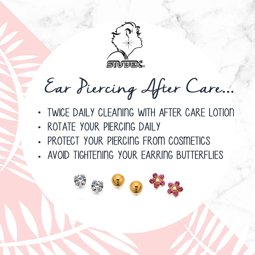 Although it may not seem it, aftercare is actually the most important part of the ear piercing process. You need to look after your new piercing by keeping the stud and ear clean to promote the best possible healing. Our qualified ear piercer will have already provided you with your free bottle of aftercare soluation and given you the best cleaning tips and advice possible.